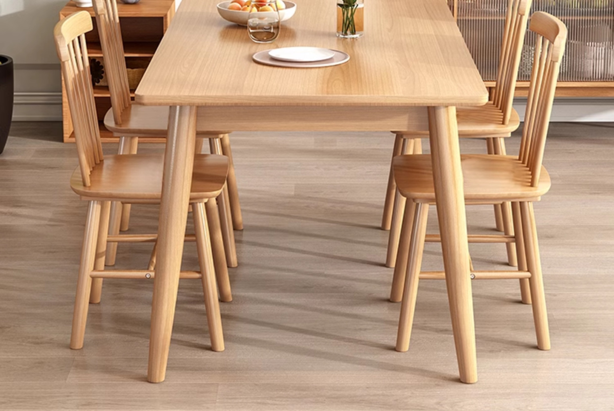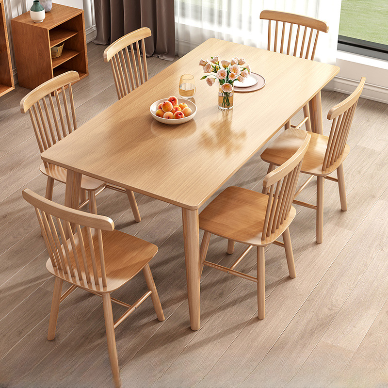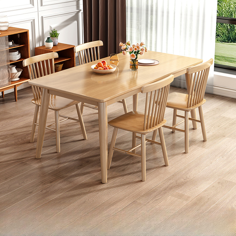 This modern minimalist solid wood dining table features a sleek design that effortlessly complements any dining space. Crafted from high-quality solid wood, it ensures durability and long-lasting beauty. Its clean lines and natural finish create a warm, inviting atmosphere perfect for family meals and gatherings.